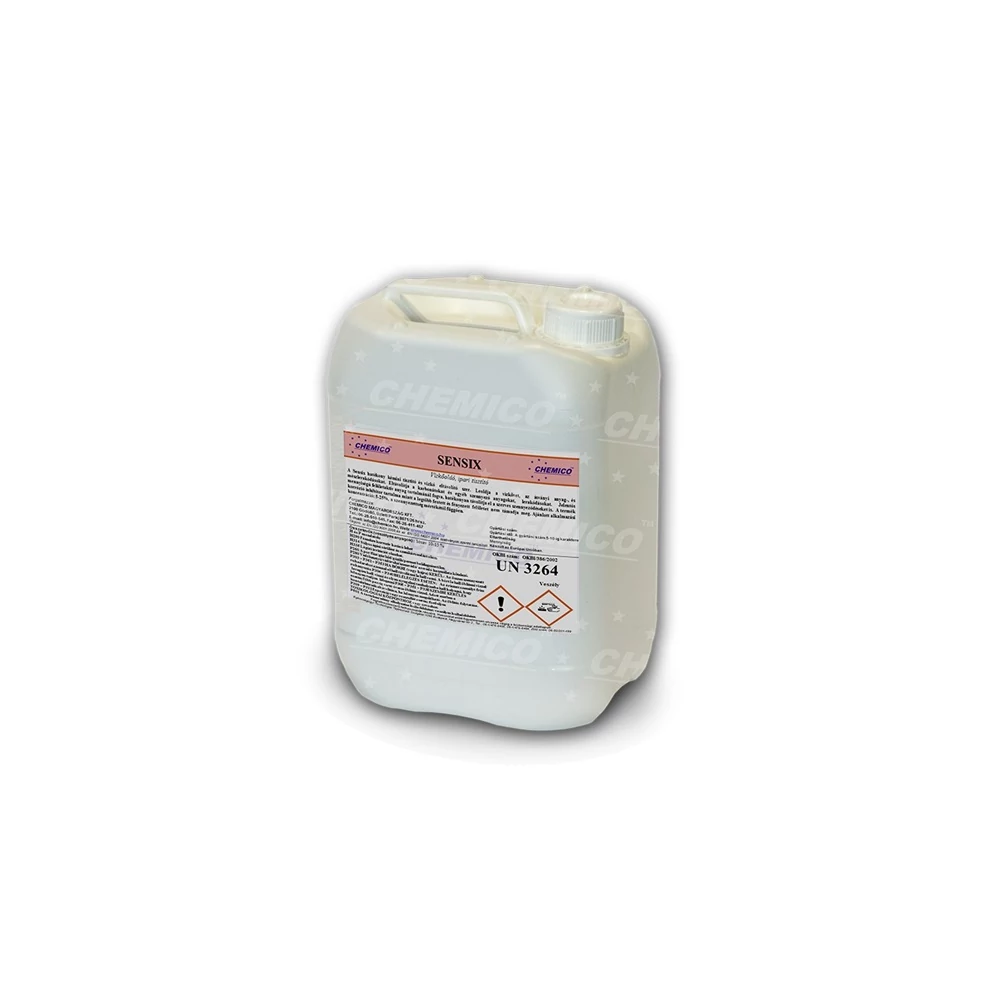 Sensix ipari vízkőoldó vízzel jól hígítható, hatékony tisztítószer koncentrátum, mely eltávolítja a vízkövet, ásványi anyagot, cement- és mészlerakódásokat, fémsókat, rozsdát. Nem károsítja a legtöbb festett és fényezett felületet. Gazdaságos, könnyen alkalmazható. Nemcsak a szervetlen kiválásokat, hanem a szerves szennyeződéseket is hatékonyan távolítja el.